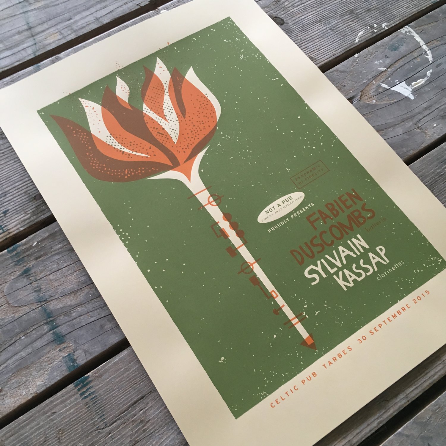 Affiche de concert sérigraphiée pour Sylvain Kassap (clarinettes) & Fabien Duscombs (batterie) au Celtic Pub à Tarbes.